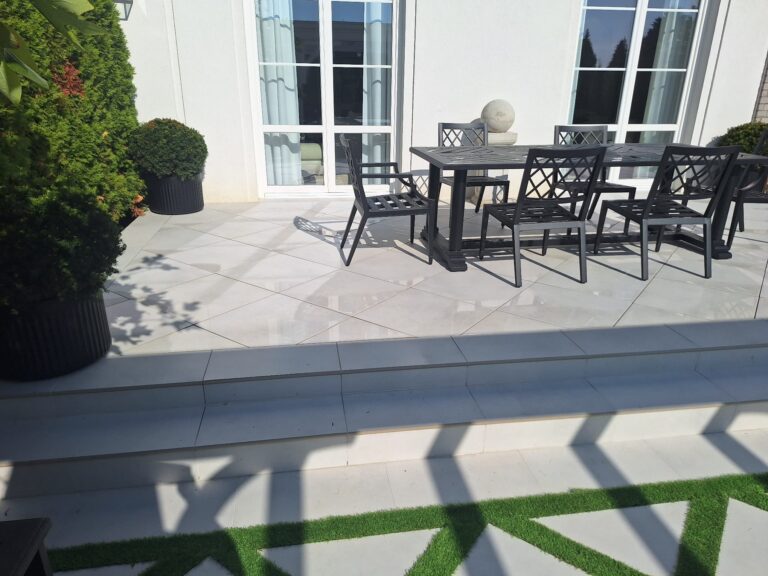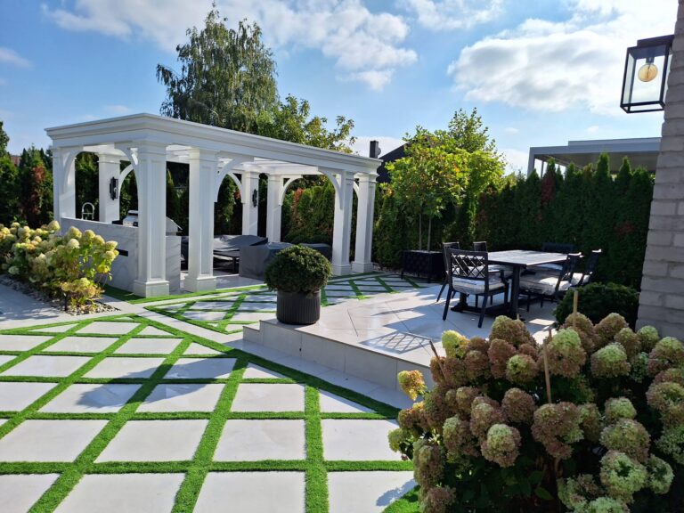 Ogród u Małgorzaty Rozynek- Majdan to 250 m² elegancji w najlepszym wydaniu. Harmonijne połączenie precyzyjnie ułożonych płyt w klasyczny wzór karo , efektownej pergoli, basenu i sztucznej trawy tworzy przestrzeń rodem z katalogu luksusowych rezydencji. To miejsce, gdzie styl spotyka się z wygodą – idealne do relaksu przy basenie czy spotkań przy eleganckim grillu w wyjątkowej atmosferze.