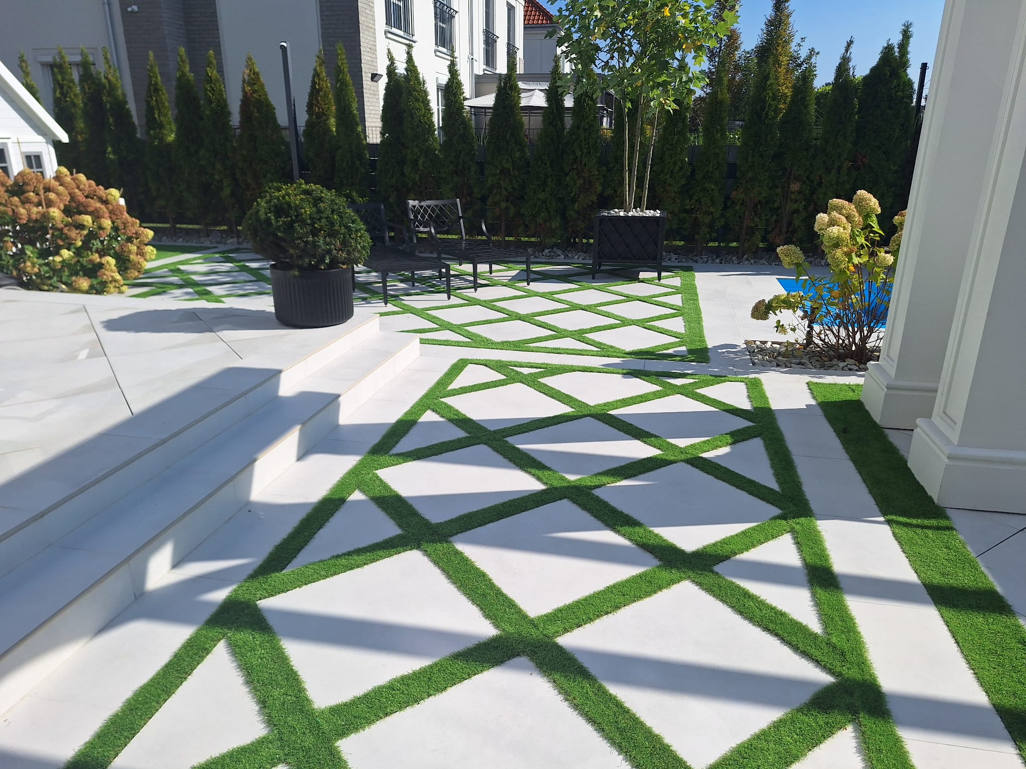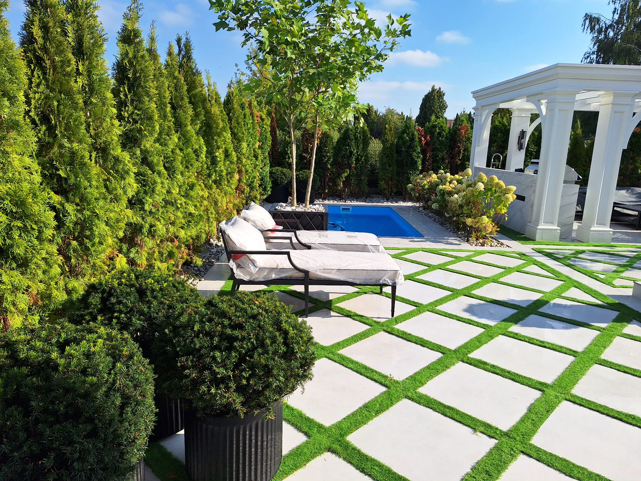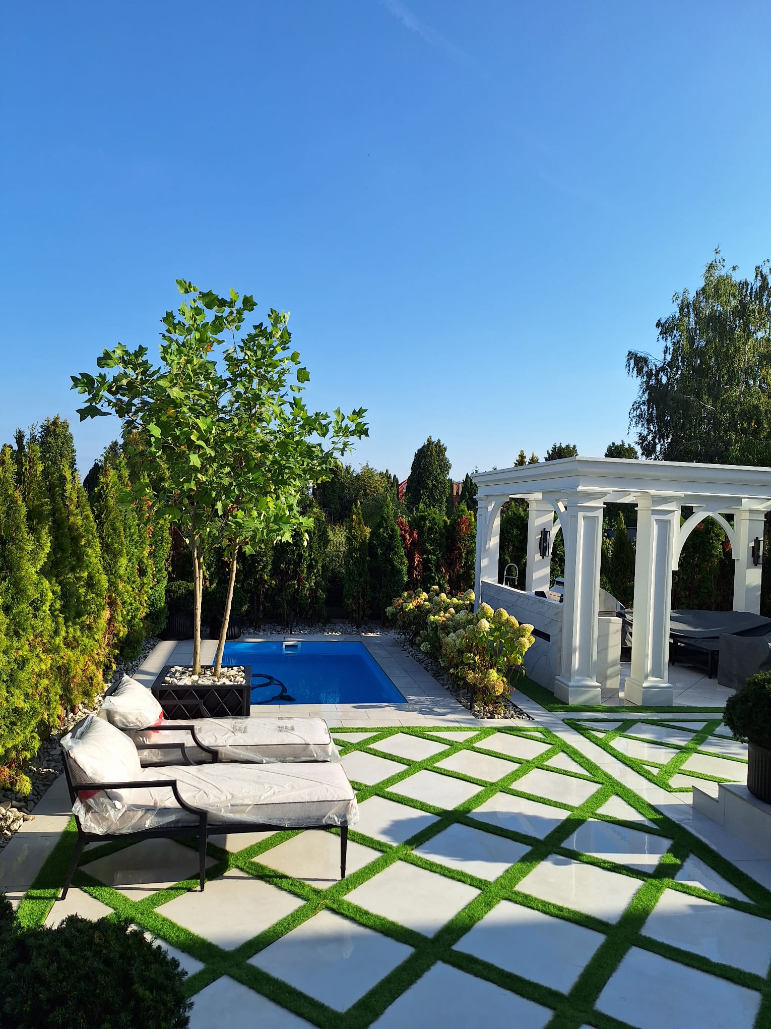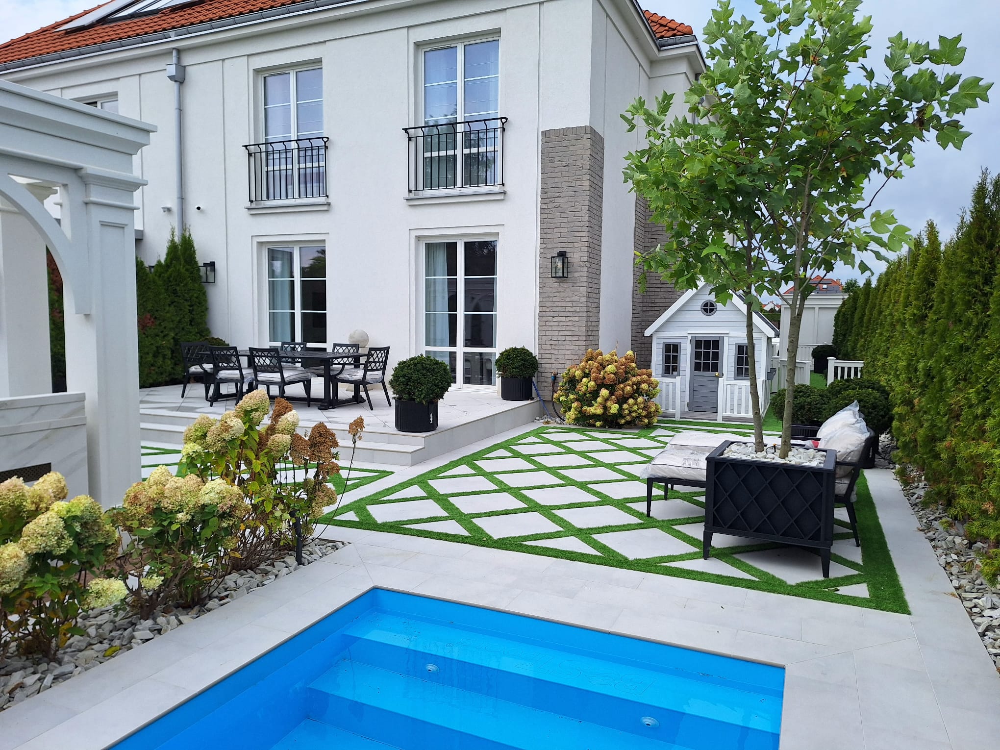 Ogród u Małgorzaty Rozynek- Majdan to 250 m² elegancji w najlepszym wydaniu. Harmonijne połączenie precyzyjnie ułożonych płyt w klasyczny wzór karo , efektownej pergoli, basenu i sztucznej trawy tworzy przestrzeń rodem z katalogu luksusowych rezydencji. To miejsce, gdzie styl spotyka się z wygodą – idealne do relaksu przy basenie czy spotkań przy eleganckim grillu w wyjątkowej atmosferze.