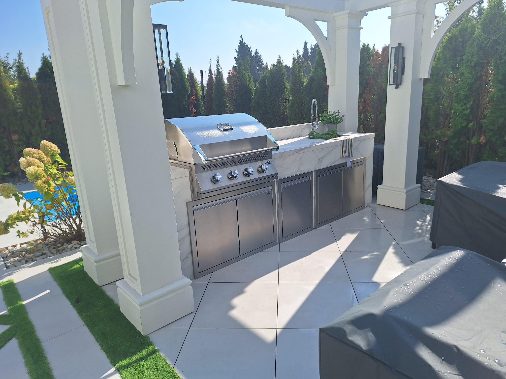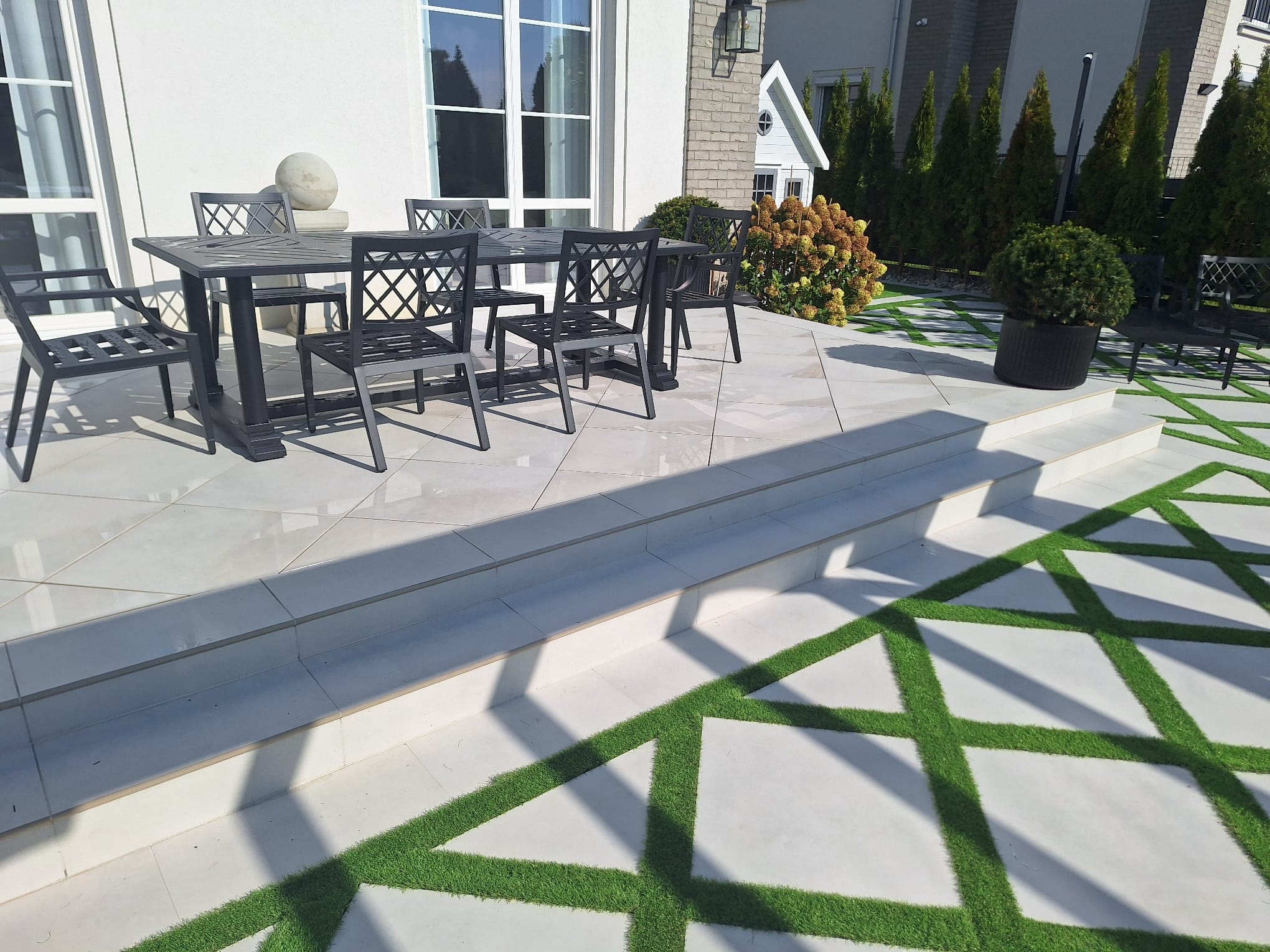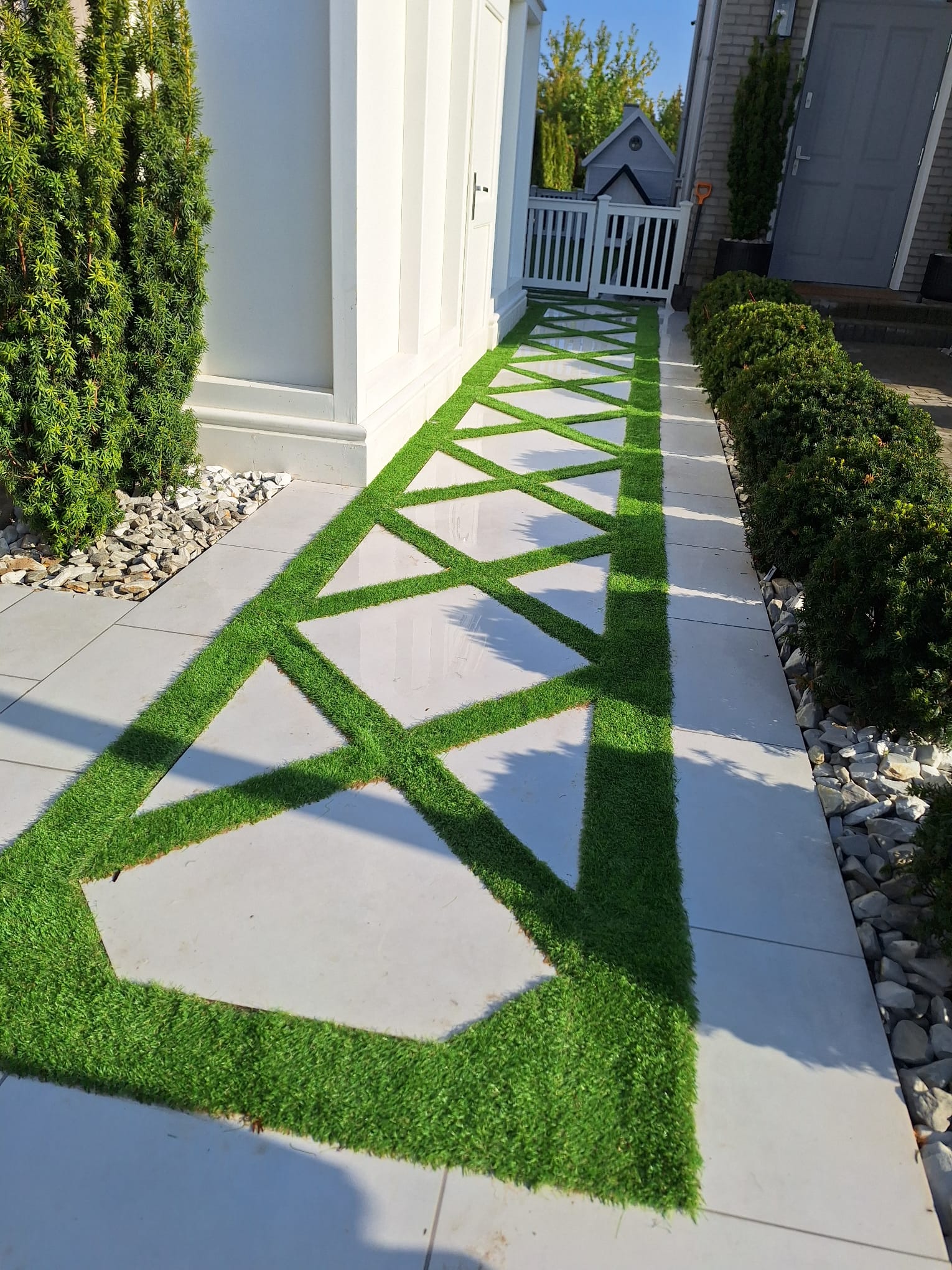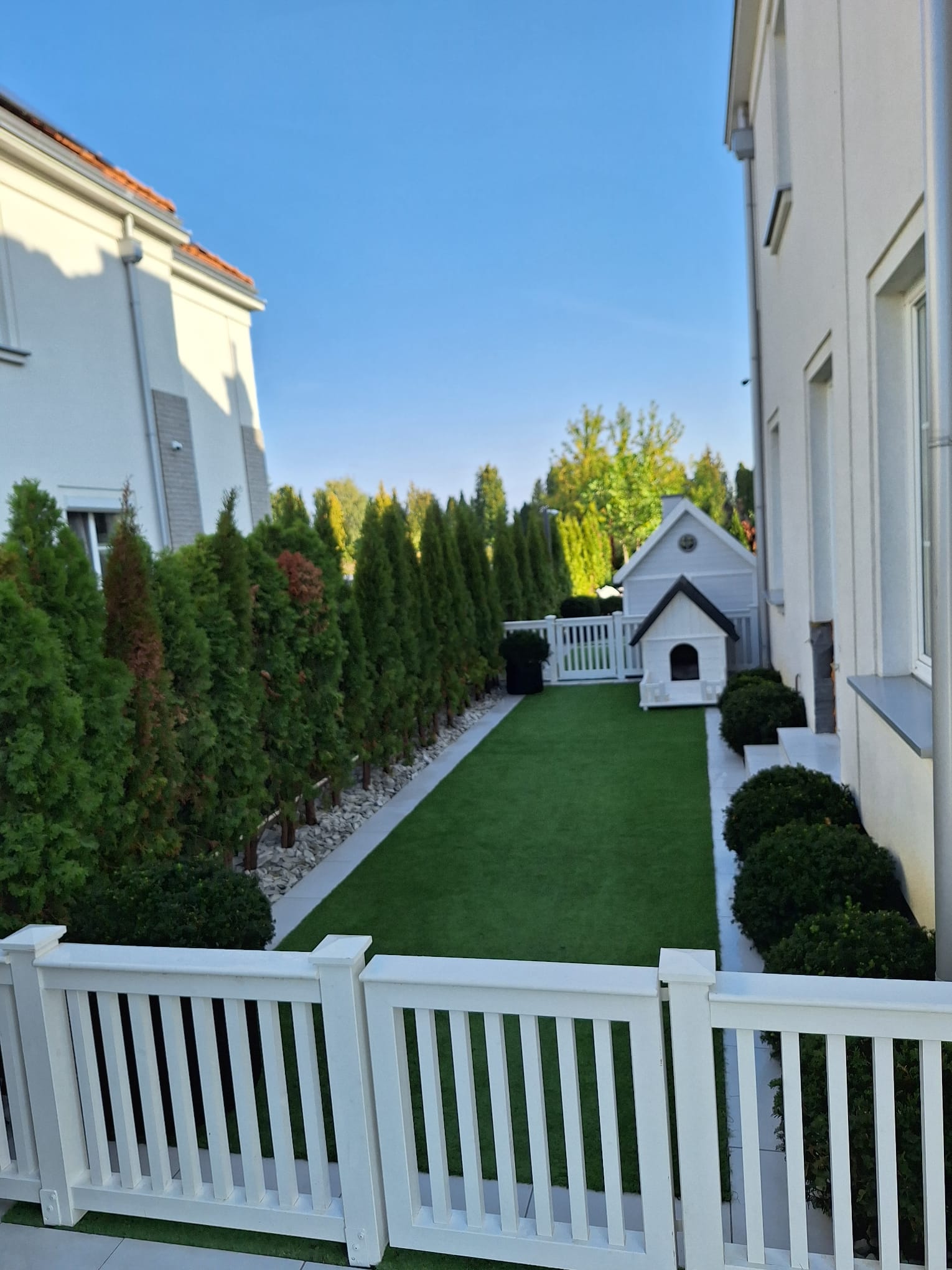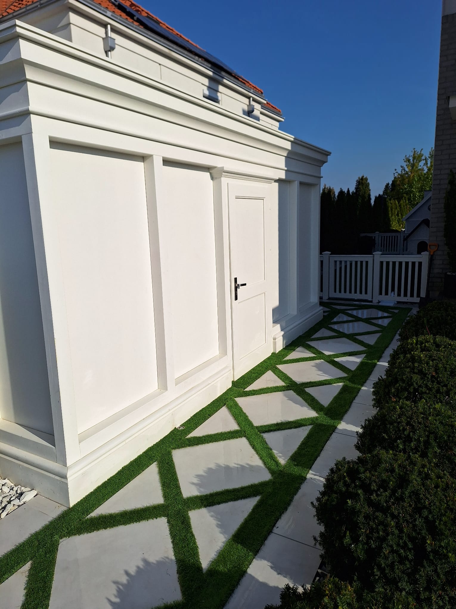 Ogród u Małgorzaty Rozynek- Majdan to 250 m² elegancji w najlepszym wydaniu. Harmonijne połączenie precyzyjnie ułożonych płyt w klasyczny wzór karo , efektownej pergoli, basenu i sztucznej trawy tworzy przestrzeń rodem z katalogu luksusowych rezydencji. To miejsce, gdzie styl spotyka się z wygodą – idealne do relaksu przy basenie czy spotkań przy eleganckim grillu w wyjątkowej atmosferze.