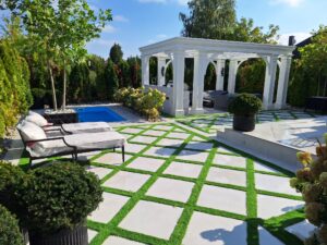 Rezydencjonalny ogród pełen klasy – elegancka przestrzeń, w której geometryczne rabaty, monumentalne donice i soczysta zieleń trawnika tworzą wyjątkową harmonię. Centralne schody prowadzą ku rezydencji, a otoczenie hortensji, krzewów i kamiennych ścieżek podkreśla luksusowy charakter miejsca. To idealna sceneria do odpoczynku, spotkań i życia w wielkim stylu.